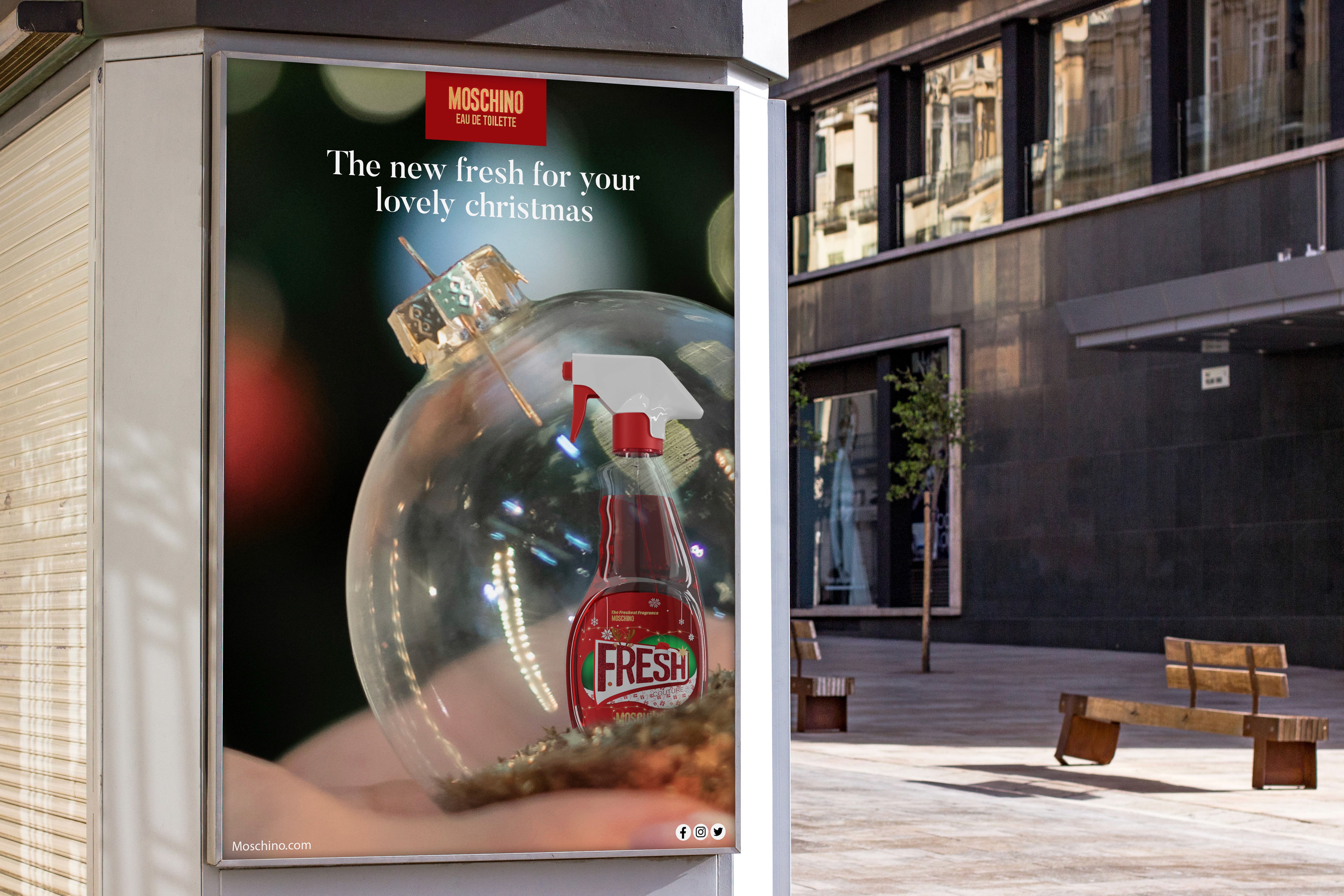 Crear una edición limitada navideña para un perfume de Moschino, reinterpretando el icónico diseño del frasco en formato “spray” y adaptándolo a un universo visual festivo, lujoso y divertido. El reto consistía en desarrollar el producto, su packaging exclusivo y una campaña publicitaria completa capaz de captar la atención durante la temporada de Navidad.